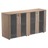 Les armoires présentent une finition mélaminé aluminium avec joues et top en Frêne Noir ou Noyer naturel. Le top, le socle et les côtés ont une épaisseur de 18 mm x 10 mm pour le fond. Équipées de tablettes de 25 mm, elles disposent de vérins réglables et de portes battantes en verre fumé de 5 mm, avec serrures et poignées métalliques. Choisissez entre les coloris Frêne Noir et Noyer naturel pour un look sophistiqué.