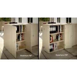 Conçues pour élégance et fonctionnalité, ces armoires modulaires s'adaptent à tout espace professionnel. En mélamine robuste, elles offrent une structure solide. Les finitions variées, de l'Argent au Noir, permettent une personnalisation. Les portes s'ouvrent soit à 110° ou 270° au choix et sont sécurisables. Les poignées s'harmonisent avec la couleur de l'armoire. Les étagères, en mélamine ou métal, sont résistantes. Cette gamme d'armoires convient à tous les espaces de travail.