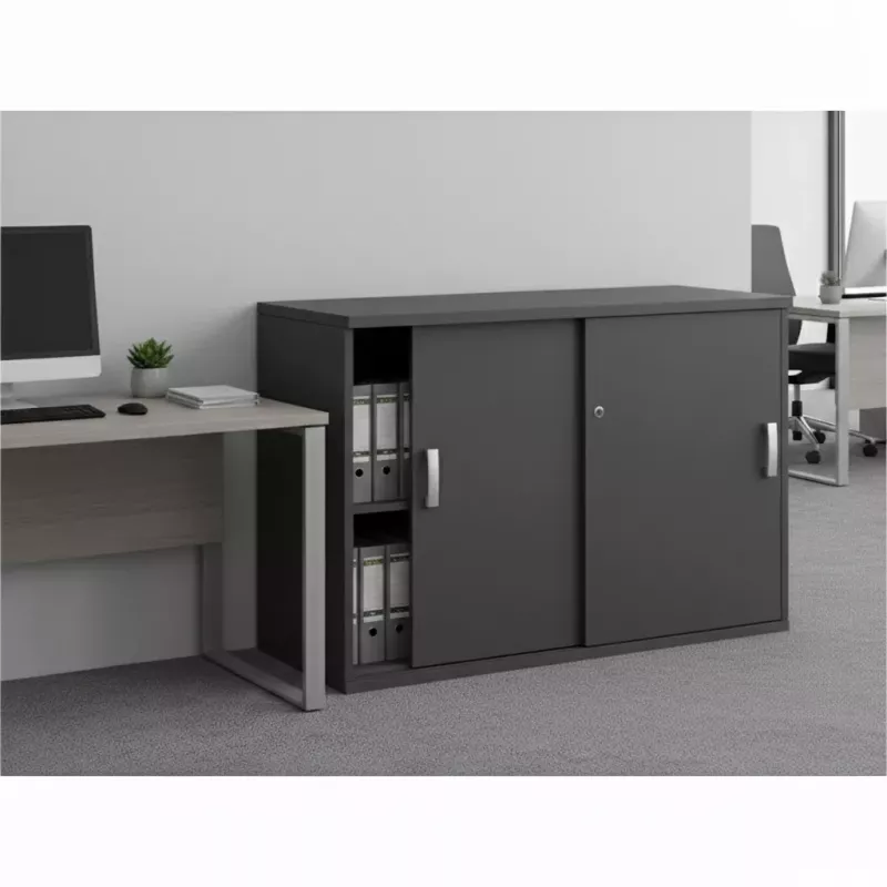 Les armoires en mélaminé de 25 mm, bordées d'un chant de 2 mm, offrent une variété de finitions, de l'Argent au Chêne Grisé. Les côtés, de 19 mm, garantissent un espacement d'au moins 32 cm entre les étagères. Les portes coulissantes de 19 mm, montées sur roulements à bille, proposent diverses serrures et finitions. Deux types de poignées sont disponibles, assorties à la couleur de l'armoire. Les étagères, en mélamine de 25 mm ou en métal pour des longueurs supérieures à 100 cm, présentent des finitions variées, dont l'époxy. Ces armoires modulaires s'adaptent idéalement à tout espace de bureau.