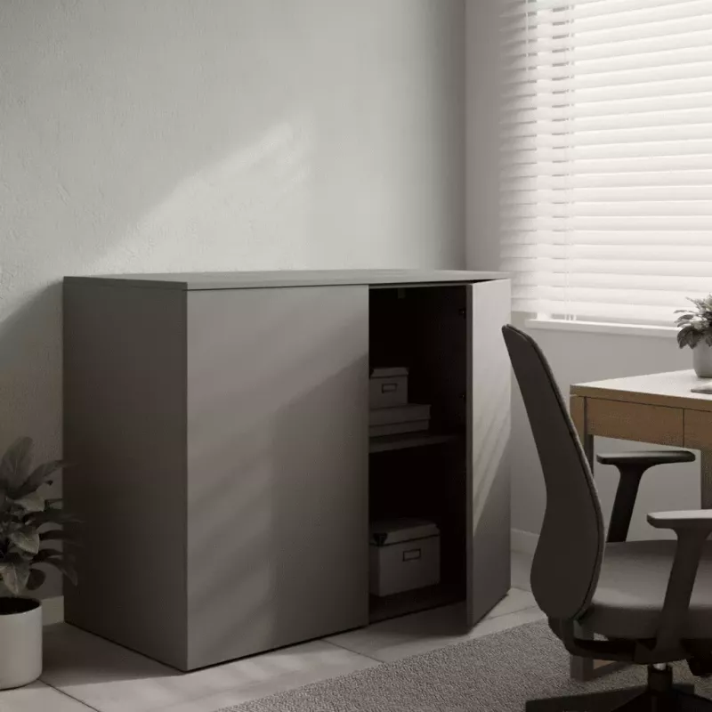 Les armoires en mélaminé garantissent solidité et style. Elles proposent des finitions variées comme Argent, Blanc, Graphite, et plus encore. Avec des côtés de 19 mm, elles assurent une séparation d'au moins 32 cm entre les étagères. Les portes "push open" s'ouvrent au choix à 110° ou à 270° sans poignées. D'autres modèles offrent des poignées adaptées à la couleur de l'armoire. Les étagères en mélamine ont un chant frontal de 2 mm à 0,8 mm. Pour plus de 100 cm, des étagères métalliques sont disponibles. Ce système modulaire s'intègre parfaitement dans tout bureau.