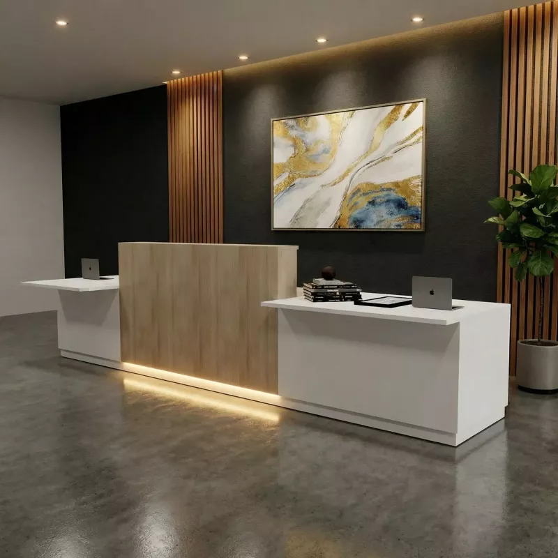 La banque d'accueil PMR de 3m84 de large est l'incarnation parfaite de l'élégance et de l'inclusivité. Avec ses 3 éléments intégrés, elle est conçue pour accueillir chaleureusement tous vos visiteurs. Les plateaux, dotés de perçages pour obturateurs et d'inserts métalliques, assurent une fixation solide et durable. Elle se décline en plusieurs couleurs telles que l'argent, le blanc, le graphite et le noir, permettant de s'adapter à tous les décors intérieurs. Pour ceux qui recherchent une touche supplémentaire de sophistication, un éclairage LED en option est disponible. Choisissez cette banque d'accueil pour combiner fonctionnalité, durabilité et esthétique dans votre espace d'accueil.