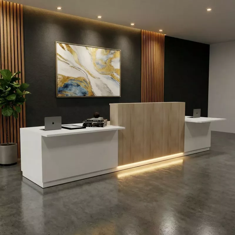 Cette banque d'accueil PMR de 4m24 de large est une combinaison parfaite de style et de fonctionnalité, conçue pour offrir un accueil inclusif à tous vos visiteurs. Composée de 3 éléments, elle est robuste avec ses plateaux équipés de perçages pour obturateurs et d'inserts métalliques pour une fixation solide. Les couleurs disponibles pour cette banque d'accueil sont variées, allant de l'Acacia Clair, Acacia Foncé, Argent, Blanc, Chêne Grisé, Chêne Moyen, Chêne Veiné, Graphite, Gris, Hêtre, Noir, Poirier à Wengué. Pour une touche de modernité, un éclairage LED en option est proposé. La structure est renforcée par une structure de tube en acier, assurant sa durabilité. Choisissez cette banque d'accueil pour une première impression mémorable dans votre espace professionnel.