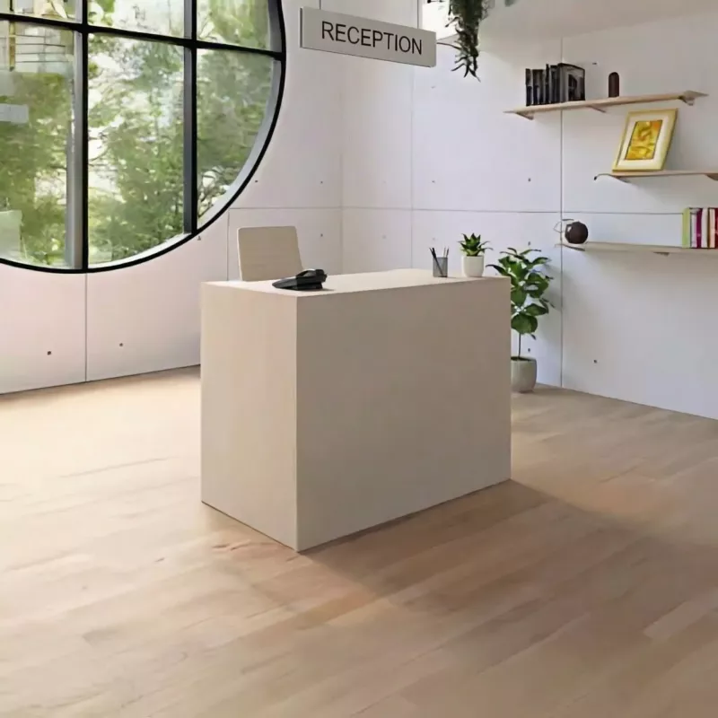 Cette banque d'accueil de 144 cm offre des plateaux mélaminés de 25 mm avec chants de 2 mm et panneaux verticaux de 19 mm. Disponible en 13 finitions (Graphite, Blanc, Hêtre, Chêne, etc.), elle inclut des obturateurs ronds et vérins de réglage. Option goulotte passe-câbles disponible.
