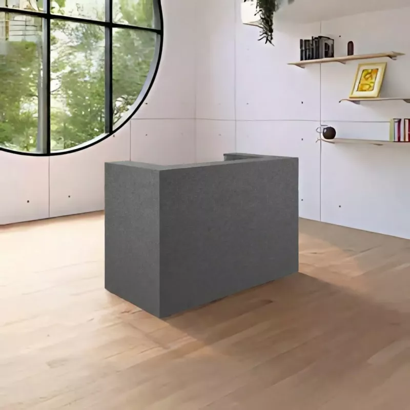 Cette banque d'accueil de 184 cm offre des plateaux mélaminés de 25 mm avec chants de 2 mm et panneaux verticaux de 19 mm. Disponible en 13 finitions (Graphite, Blanc, Hêtre, Chêne, etc.), elle inclut des obturateurs ronds et vérins de réglage. Option goulotte passe-câbles disponible.