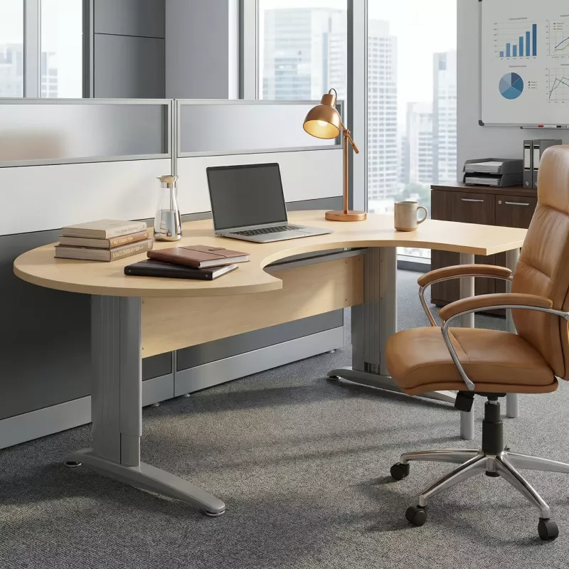 Compléments : plateaux retour, exécutif, demi-rond et semi-elliptiques, fabriqués en mélaminé de 25mm chants en ABS de 2mm. Finitions en graphite, blanc, gris, hêtre, chêne, poirier, wengué, acacia clair, acacia foncé, chêne veiné, chêne grisé et noir. Optionnel, fabrication en panneau stratifié. Fixés au plateau principal à l’aide de platines métalliques.
