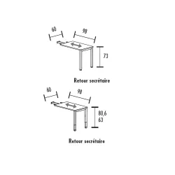 Les plateaux de retour sont fabriqués en mélaminé de 25 mm avec des chants en ABS de 2mm. Les finitions disponibles sont : graphite, blanc, gris, hêtre, chêne, poirier, wengué, acacia clair, acacia foncé, noir, chêne veiné et chêne grisé. En option, ils peuvent être fabriqués en panneau stratifié. Ils sont fixés au plateau principal à l’aide de platines métalliques.