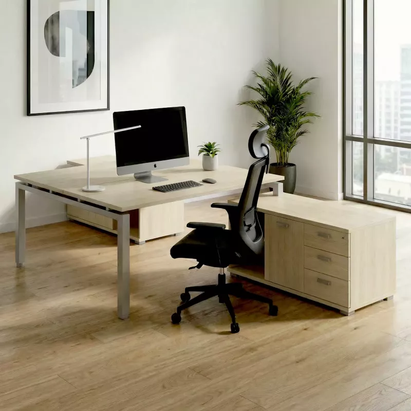 Compléments : plateaux retour, exécutif, angles, demi-rond et semi-elliptiques, fabriqués en mélaminé de 25 mm chants en ABS de 2mm. Finitions en graphite, blanc, gris, hêtre, chêne, poirier, wengué, acacia clair, acacia foncé, chêne veiné, chêne grisé et noir. Optionnel, fabrication en panneau stratifié. Fixés au plateau principal à l’aide de platines métalliques.