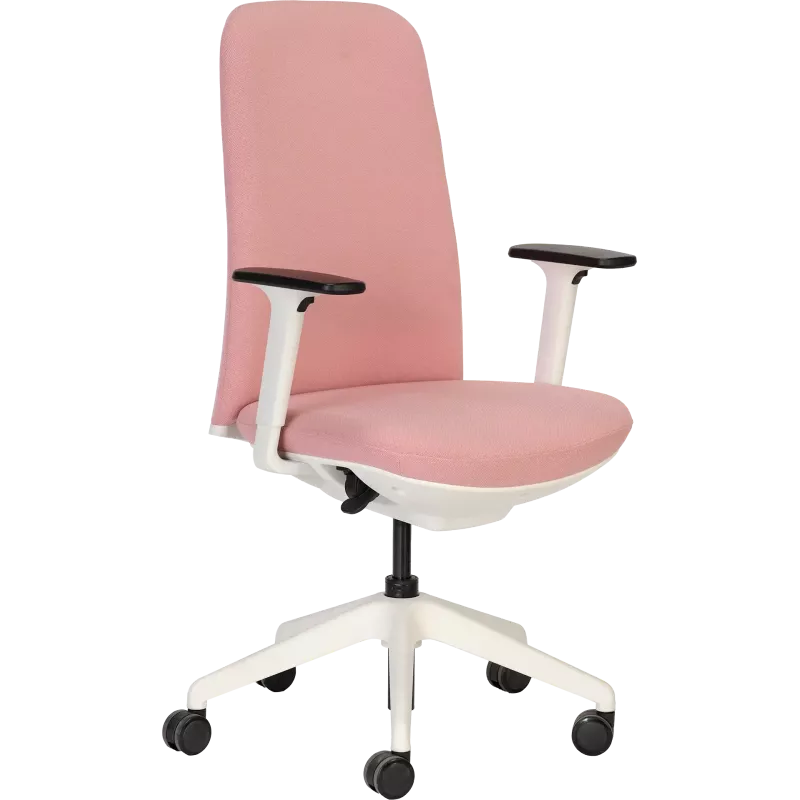 Fauteuil conçu avec un dossier et une assise en mousse sur support, recouverts de tissu polyester, et équipé d’accoudoirs réglables en hauteur. Le mécanisme se règle sous l’assise pour ajuster le confort et le basculement.