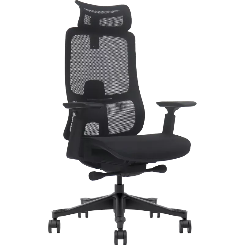 Chaise de bureau en maille avec dossier et appui-tête montés sur cadre, offrant de multiples réglages pour s’adapter à la posture et à la morphologie.
