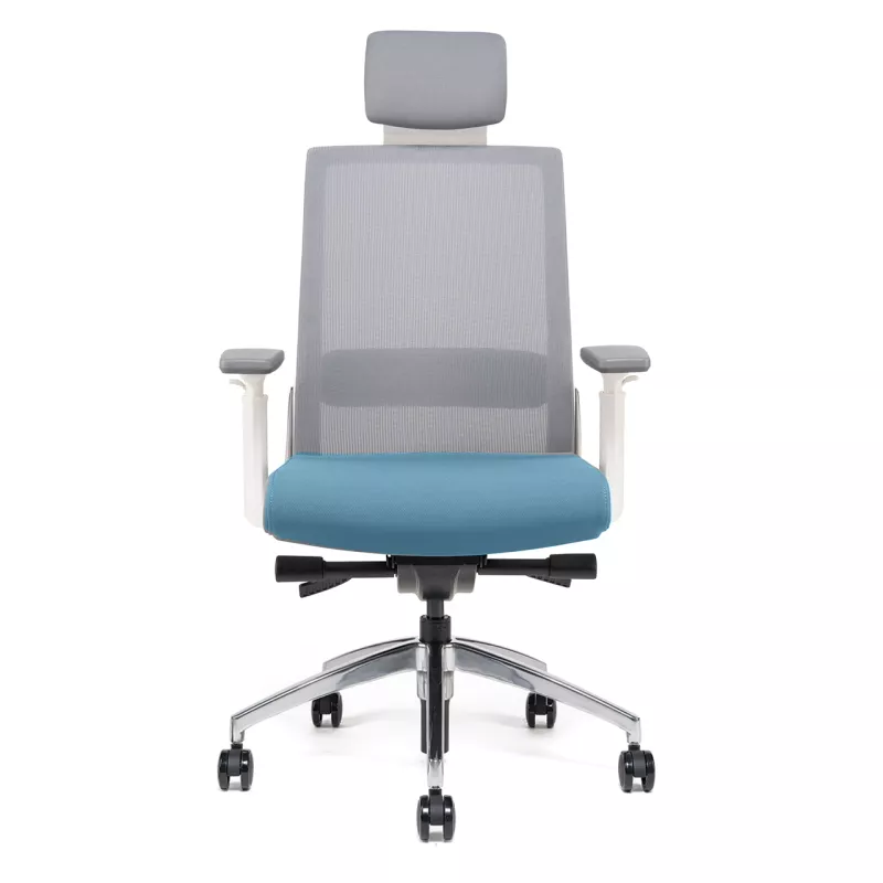 Ce siège de bureau ergonomique est doté d'un mécanisme synchrone permettant une inclinaison coordonnée de l'assise et du dossier avec un réglage de la tension. Conçu sur une structure blanche élégante, il combine une assise en tissu confortable et un dossier en résille grise pour une meilleure respirabilité.