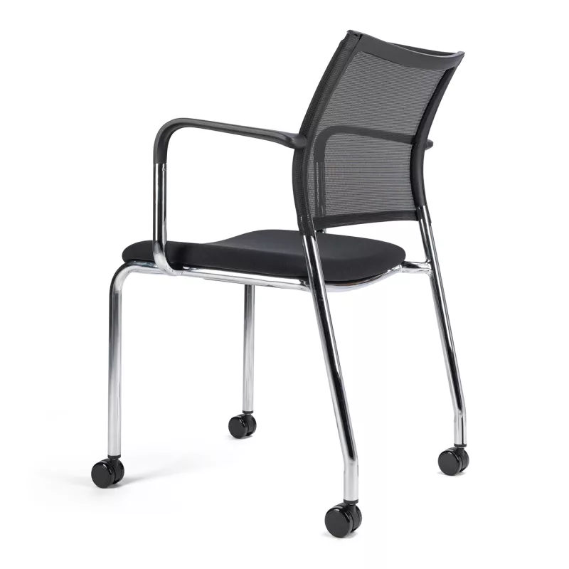 Le chaise de réunion So Portovenere allie confort et mobilité. Ce fauteuil d'accueil dispose d'une structure en acier chromé sur roulettes avec accoudoirs, d'une assise garnie en tissu ou PU disponible en plusieurs coloris, et d'un dossier ergonomique en mesh/résille noire.