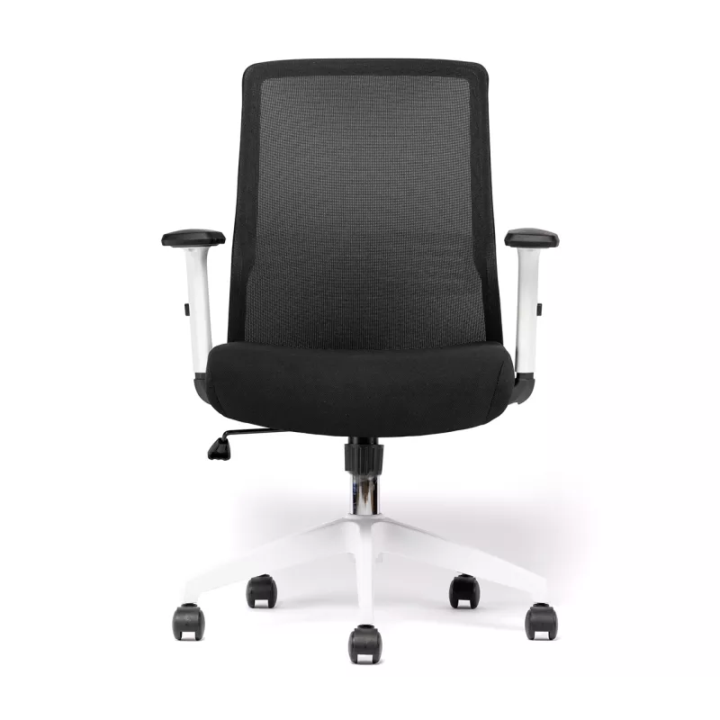 Ce siège de bureau ergonomique à mécanisme synchrone offre une structure élégante comprenant un châssis, une base et des accoudoirs de couleur blanche. Conçu pour le confort et la performance au travail, il combine une assise en tissu noir et un dossier en résille noire pour une respirabilité optimale.