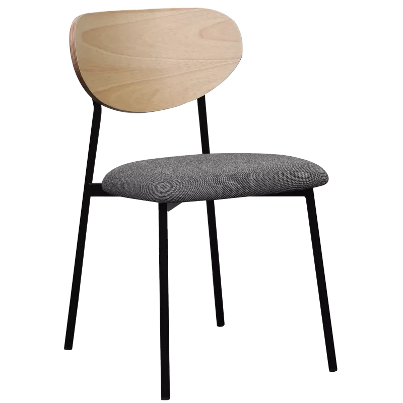 Chaise avec assise rembourrée sur support en bois multiplis, revêtue de tissu 100% polyester ou de polyuréthane. Dossier en bois multiplis avec finition vernie, et piétement 4 pieds en métal peint avec revêtement powder coating.