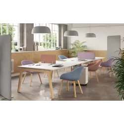 Ce panneau pour bureau est conçu avec une forme rectangulaire et un coin supérieur arrondi. Il est soutenu par deux supports circulaires robustes.