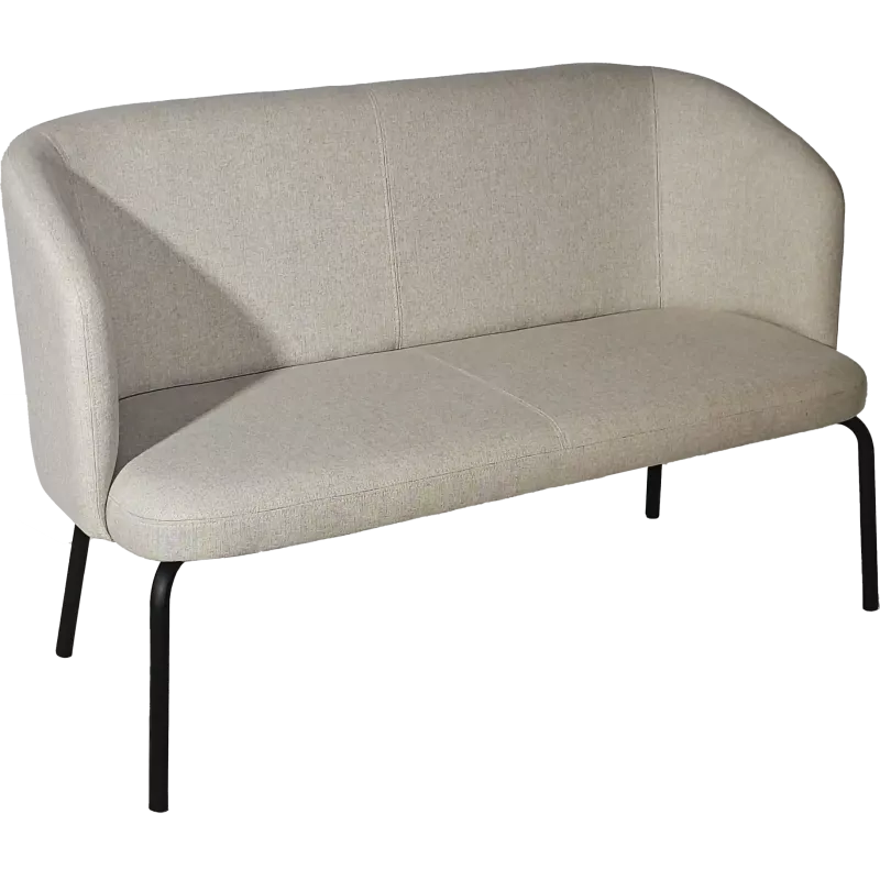 Banquette en tissu composée d’une assise et d’un dossier/accoudoirs en mousse collée sur support bois, avec une structure interne en contreplaqué et un piétement en acier peint noir.