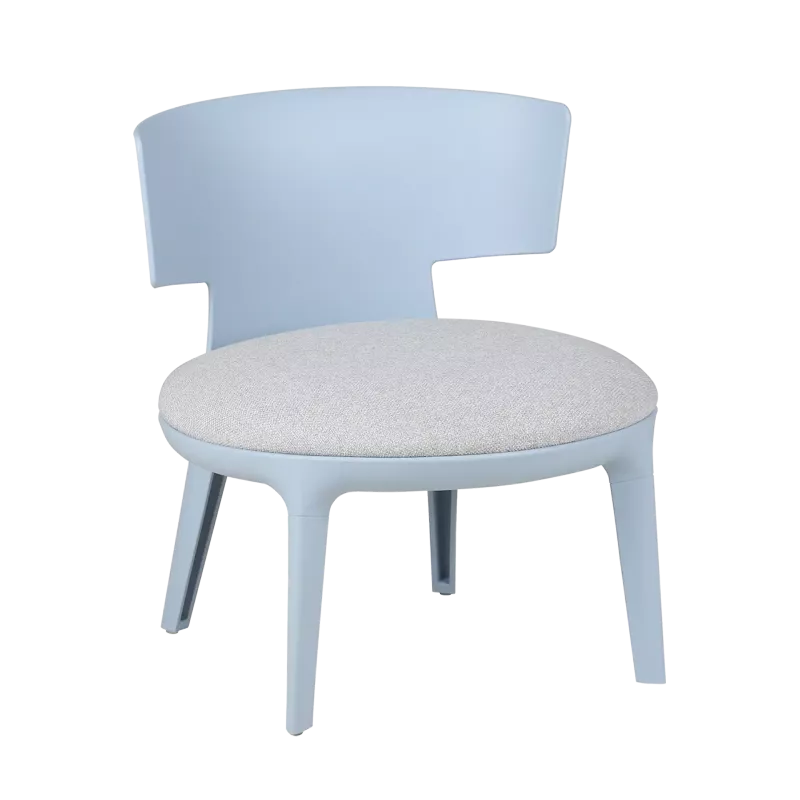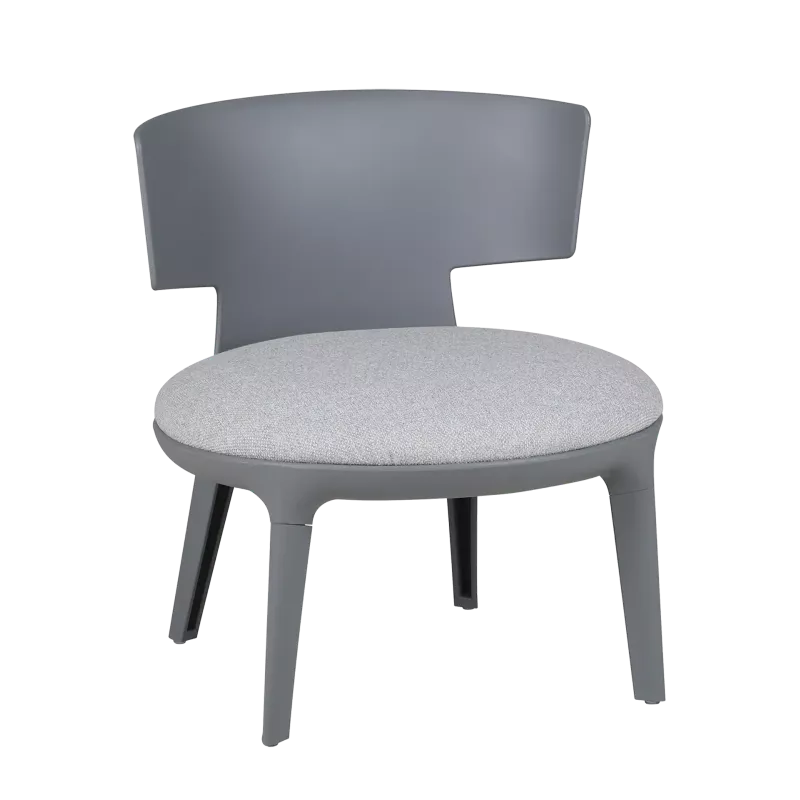 Chaise avec dossier fixe en polypropylène et assise garnie de mousse sur support plastique, recouverte de tissu. La structure et le piètement 4 pieds sont entièrement réalisés en polypropylène.