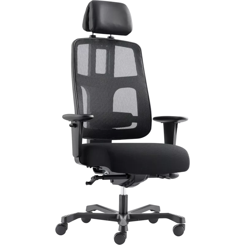 Fauteuil conçu pour un usage intensif 24/24 h, offrant des réglages ergonomiques complets (appui-tête, dossier avec soutien lombaire, mécanisme synchrone et accoudoirs). Revêtements techniques conformes à la norme inflammabilité CA117 selon les composants.