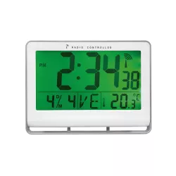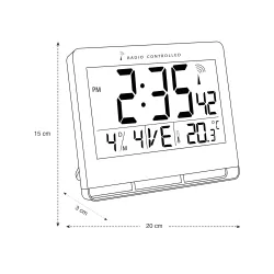 Cette horloge digitale radio pilotée multifonction offre un affichage LCD clair de l'heure (format 12/24h), de la température (10-60°C) et du jour en 5 langues. Utilisable en version murale, de table ou réveil, elle dispose d'une alarme et d'un rétro-éclairage pour une parfaite lisibilité.