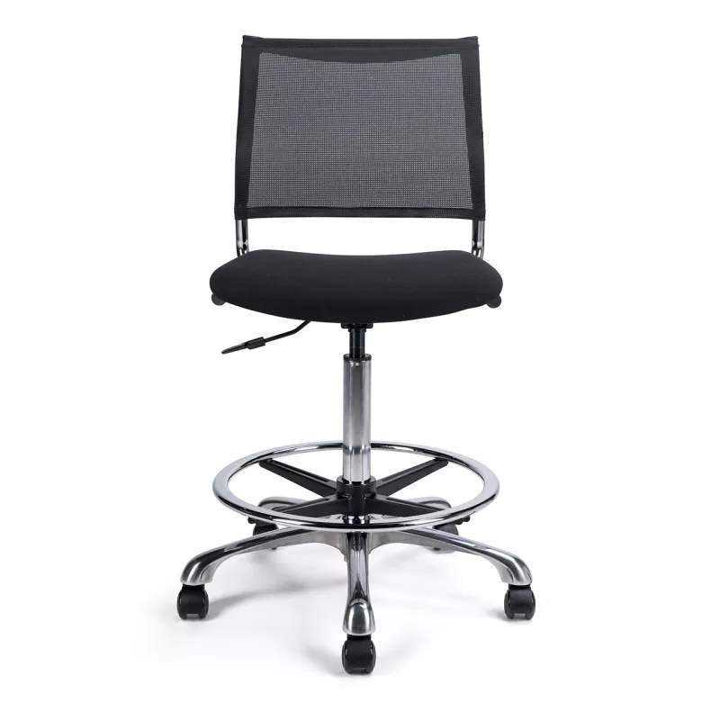 Ce siège technique est conçu pour offrir confort et robustesse dans des environnements de travail exigeants. Il est équipé d'un vérin pneumatique de 375 mm de longueur, d'une assise en tissu et d'un dossier en mesh/résille noire favorisant l'aération. Sa structure repose sur une base en aluminium poli de 640 mm de diamètre, incluant un repose-pieds en acier directement en appui sur la base.