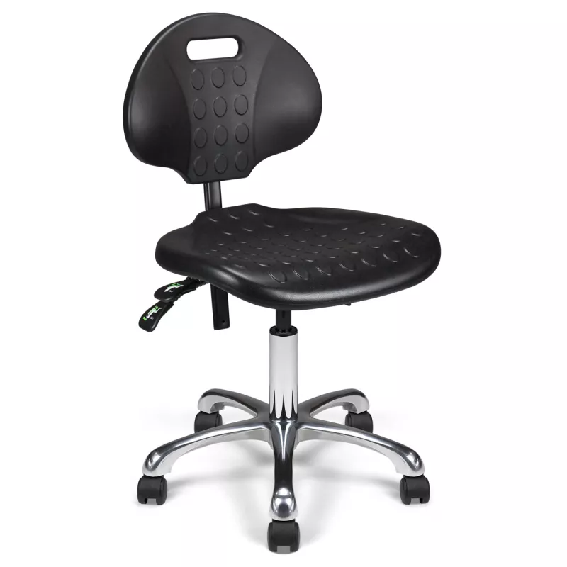 Ce siège technique est conçu pour offrir une ergonomie optimale grâce à son revêtement en polyuréthane noir haute densité sur l'assise et le dossier, garantissant robustesse et confort. Son mécanisme asynchrone permet un ajustement précis et indépendant de l'inclinaison de l'assise et du dossier pour s'adapter à chaque utilisateur.
