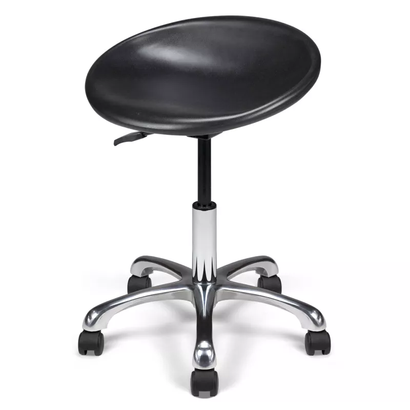 Le tabouret technique So Cesena dispose d'une assise en polyuréthane noir haute densité avec dossier intégré. Il repose sur une base en aluminium poli de 540 mm et s'ajuste facilement grâce à son vérin pneumatique d'une longueur de 305 mm.