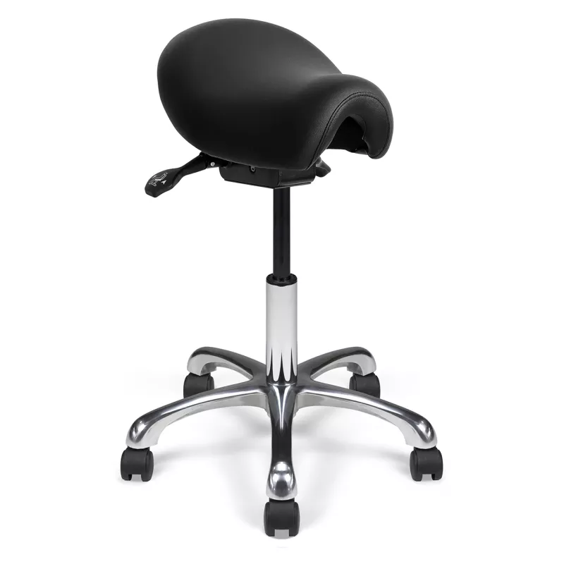 Le siège technique So Portofino dispose d'une assise rembourrée en mousse tapissée de vinyle noir. Équipé d'un vérin pneumatique de 305 mm et d'une base en aluminium poli de 540 mm, il offre un réglage précis de l'inclinaison pour un confort optimal.